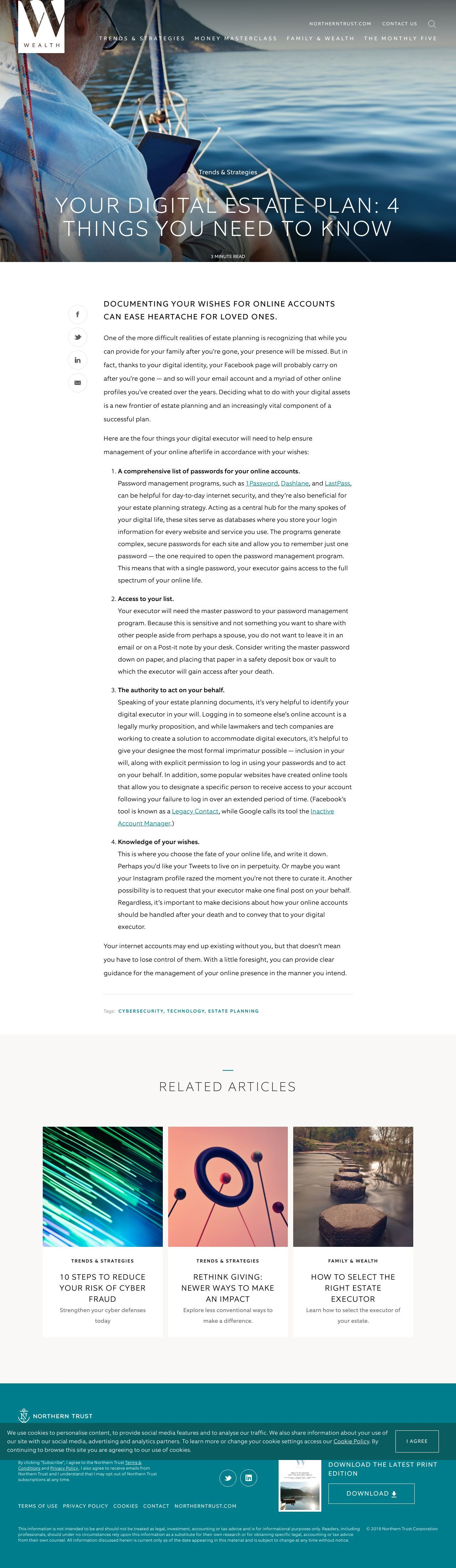 Northern Trust Wealth • January 20, 2020 Your Digital Estate Plan: 4 Things You Need To Know Documenting your wishes for online accounts can ease heartache for loved ones.