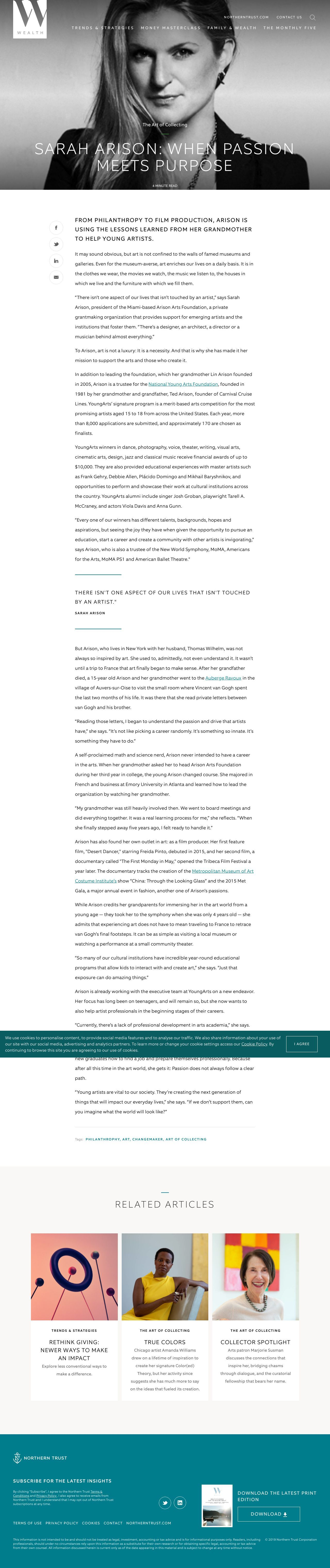 Northern Trust Wealth • January 20, 2020 Sarah Arison: When Passion Meets Purpose From philanthropy to film production, Arison is using the lessons learned from her grandmother to help young artists.
