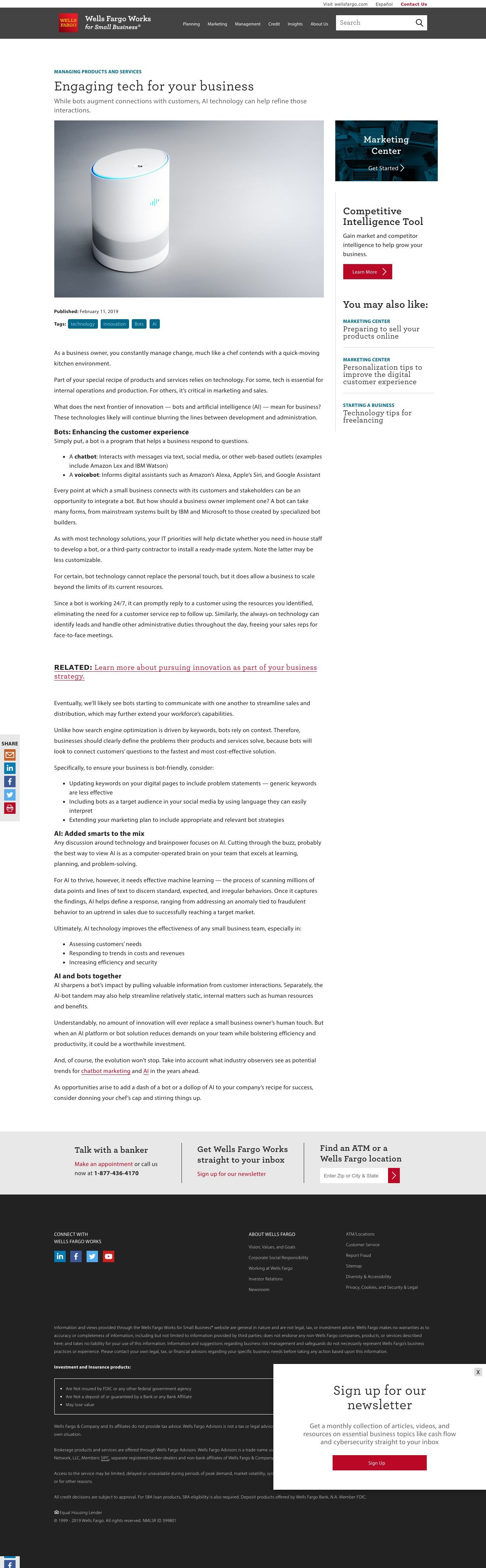 Wells Fargo Works for Small Business • January 20, 2020 Engaging Tech for Your Business While bots augment connections with customers, AI technology can help refine those interactions.