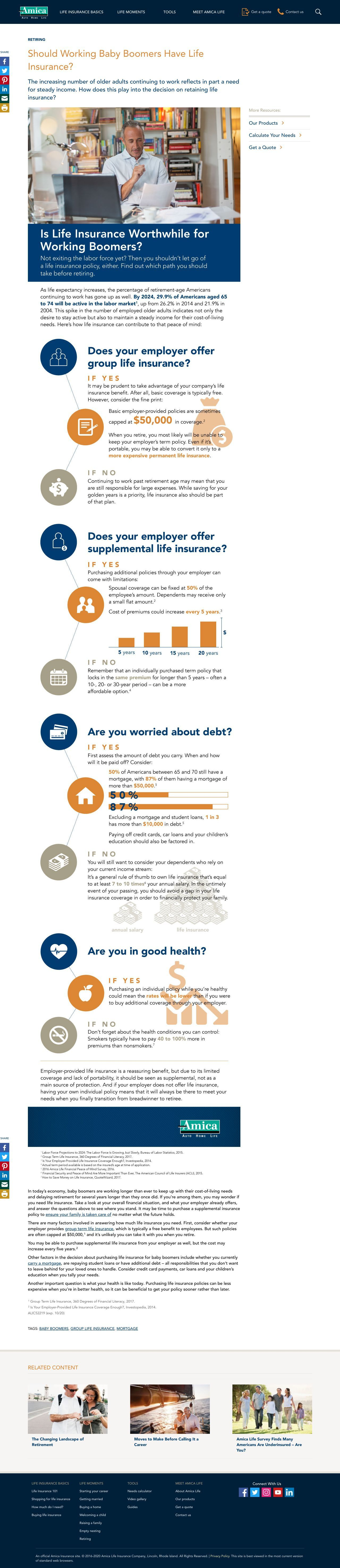 Amica Life • January 20, 2020 Should Working Baby Boomers Have Life Insurance? The increasing number of older adults continuing to work reflects in part a need for steady income. How does this play into the decision on retaining life insurance?