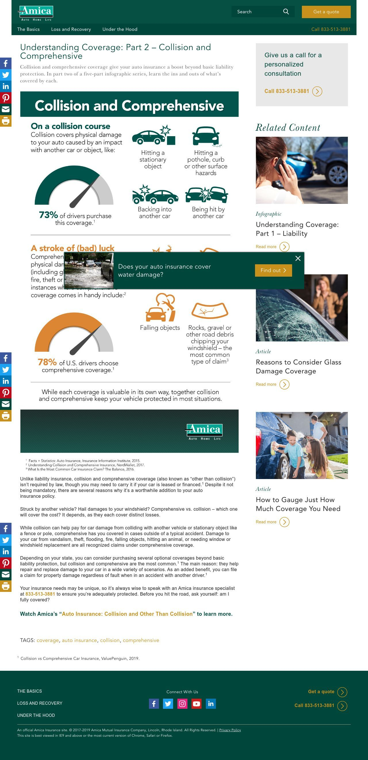 Amica Auto • January 20, 2020 Understanding Coverage: Part 2 – Collision and Comprehensive Collision and comprehensive coverage give your auto insurance a boost beyond basic liability protection. In part two of this infographic series, learn the ins and outs of what’s covered by each.