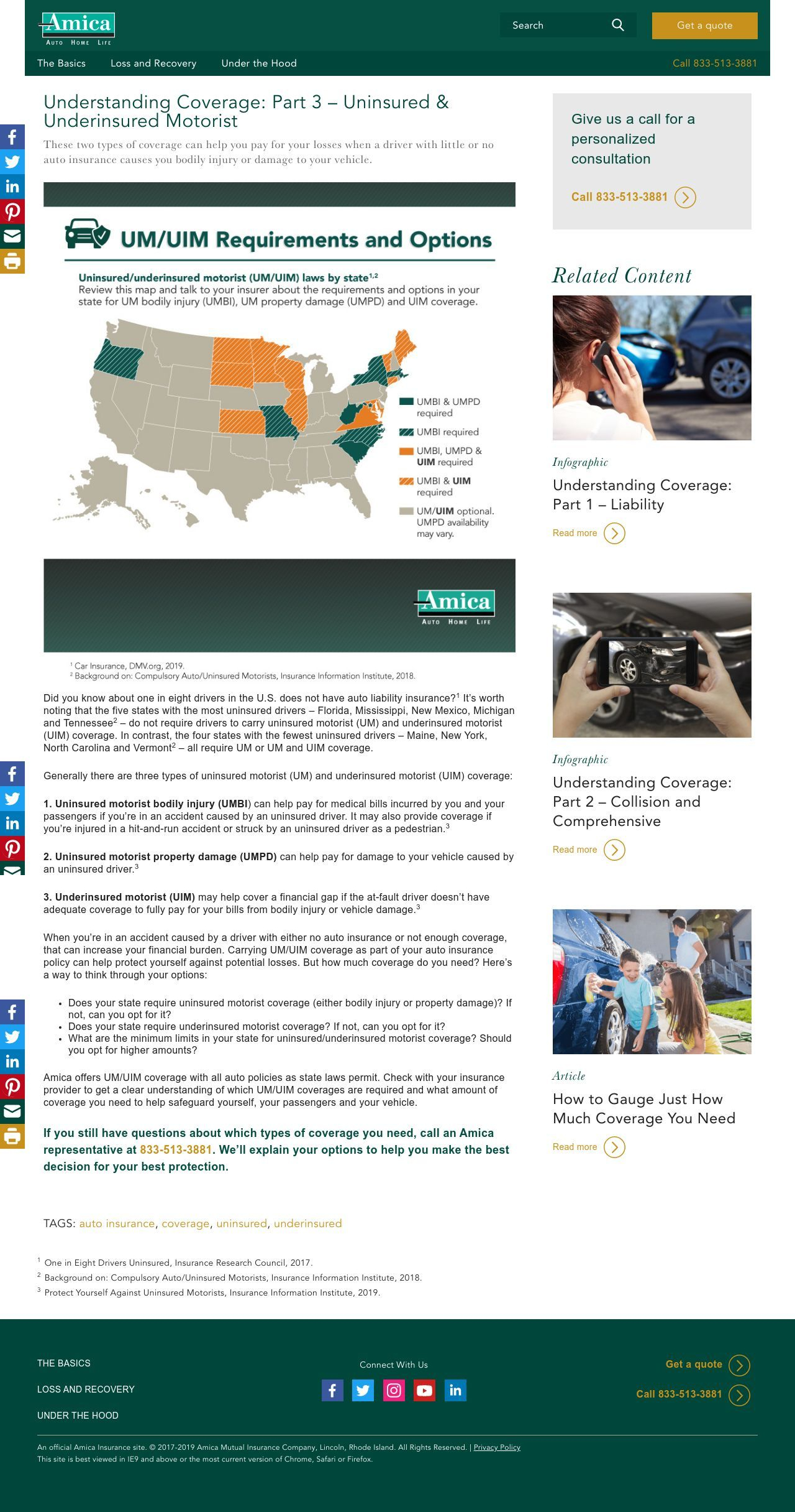 Amica Auto • January 20, 2020 Understanding Coverage: Part 3 – Uninsured & Underinsured Motorist These two types of coverage can help you pay for your losses when a driver with little or no auto insurance causes you bodily injury or damage to your vehicle.