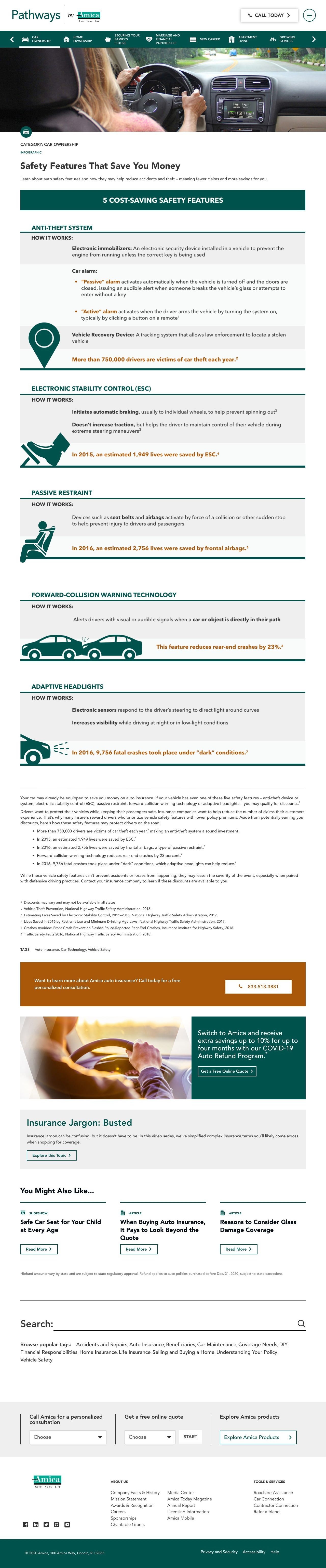 Amica Auto • July 29, 2020 Safety Features That Save You Money Learn about auto safety features and how they may help reduce accidents and theft – meaning fewer claims and more savings for you.